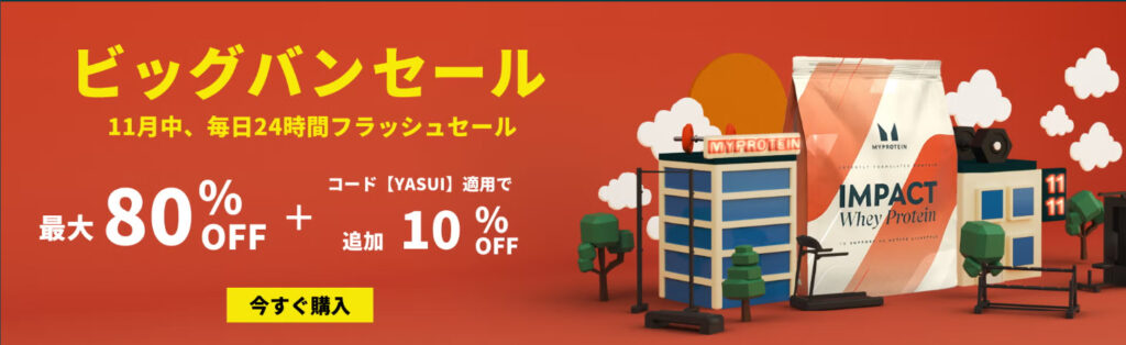 11月1日から「ビックバンセール」が行われており、「11月11日ゾロ目セール」としてプロテイン特売セールが行われています。